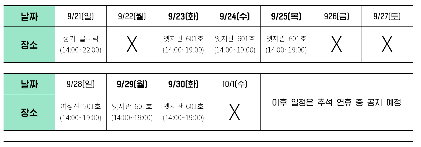 - 추석 이후 시험이 예정된 학교들은 클리닉 참여 및 추석 연휴 일정과 관련하여 추후 안내 예정입니다.