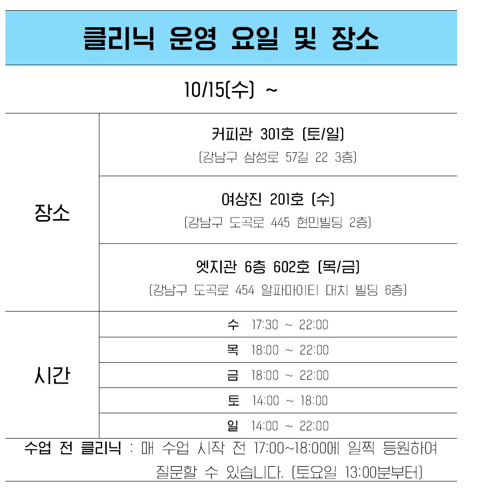강의실 : 월/목 : 강남구 도곡로 454 알파마이티 대치빌딩 6층 601호 (아트박스 건물 601호)