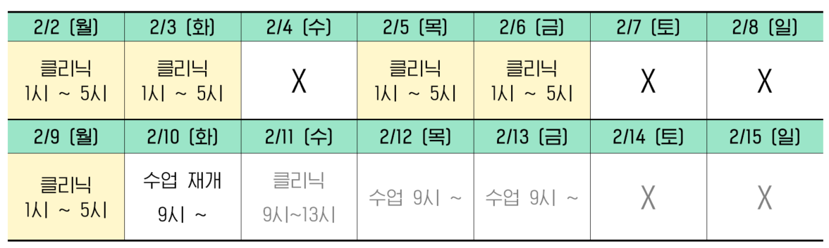▶ 휴강 기간동안 수요일을 제외하고 클리닉을 진행합니다.